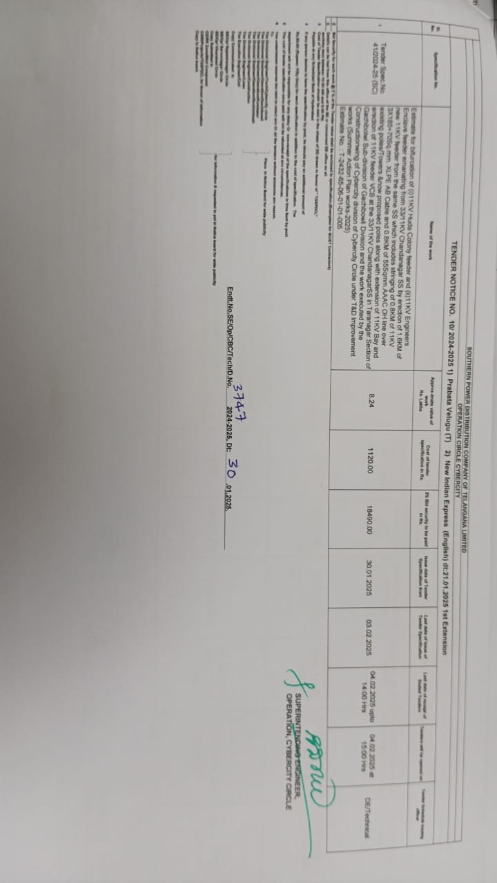 TENDER NOTIFICATION NO.13/25-26 Superintending Engineer, Operation Rajendranagar Circle. |