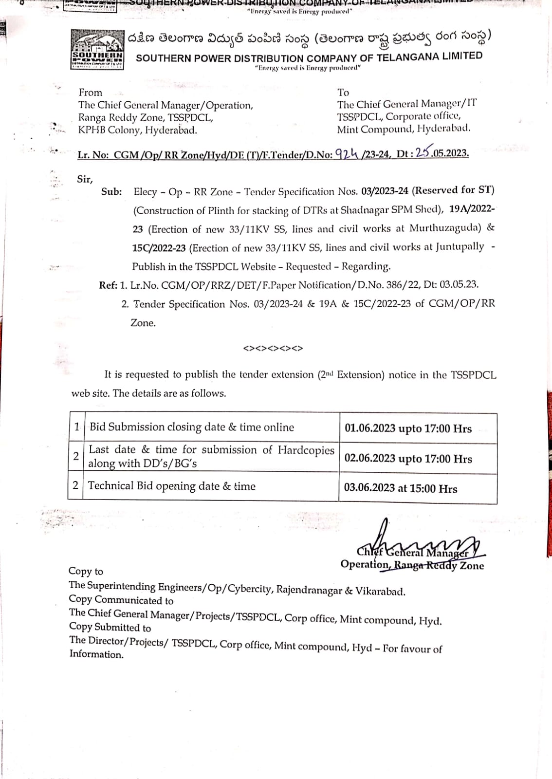 Tender Specification No.CGM/OP/RR Zone-20 21/2022-23 Chief General Manager Ranga Reddy Zone, TSSPDCL, KPHB Colony, Hyderabad. |