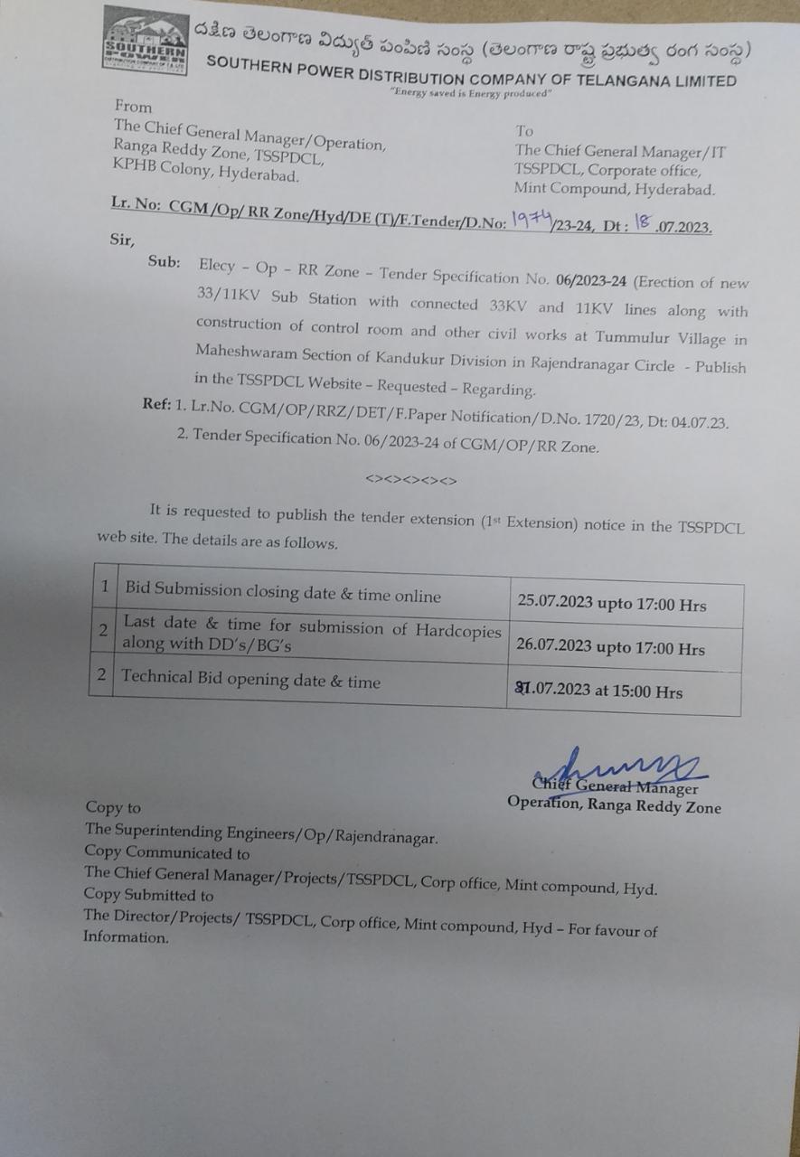 EXTENSION - 1 TENDER NOTIFICATION NO. 12/25-26 Superintending Engineer, Operation Rajendranagar Circle. |