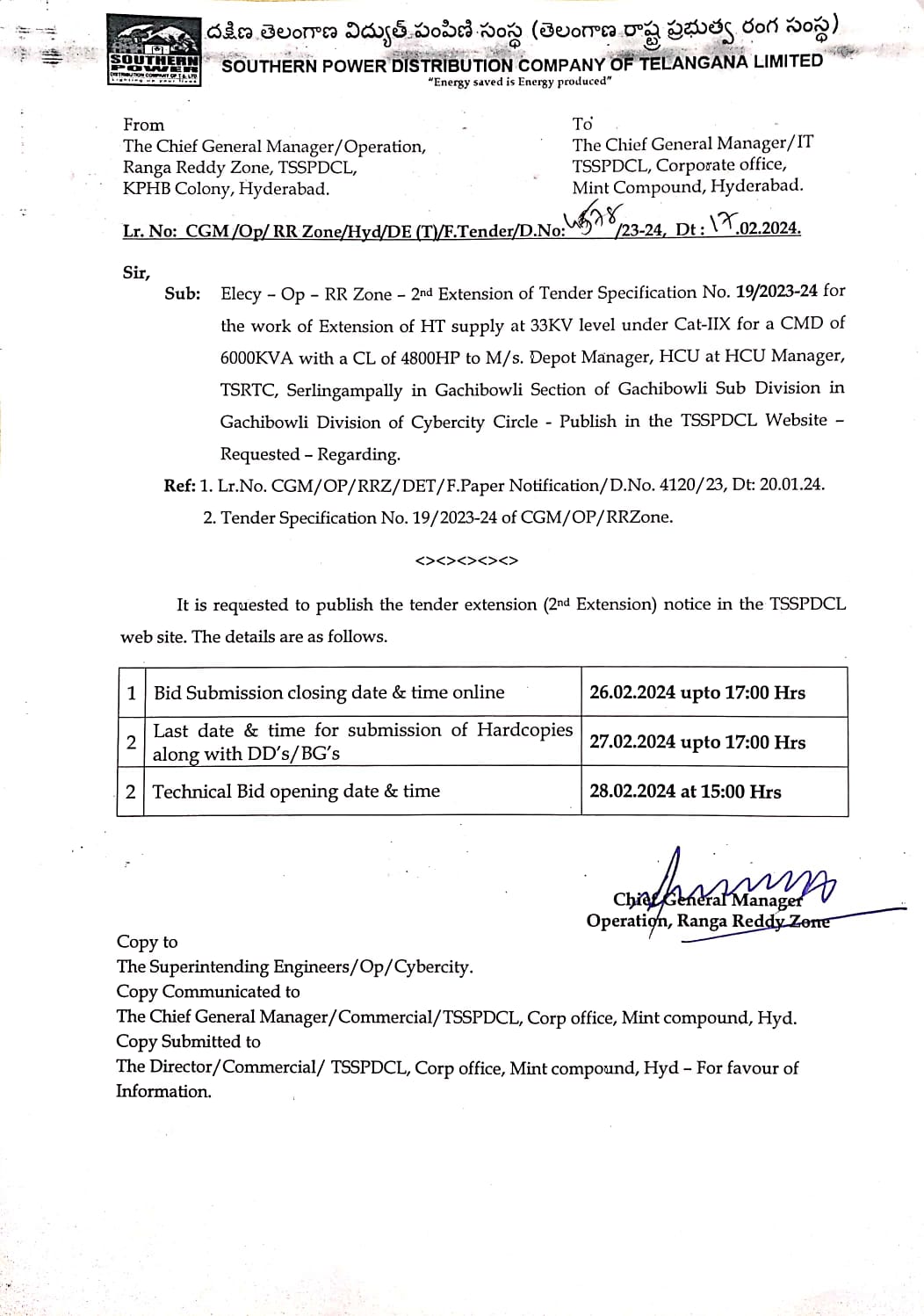 E-Procurement Tender Notice:22/2025-26. TenderSpecification.NO.43 44 45(ST) 46(SC)/25-26 Tender specification No .28/25-26(ECV>100L) 2nd Extension Tender Specification. 34 Recall of 24 33(SC)/ 25-26. Chief General Manager Operation, Rural Zone,TSSPDCL, Gagan Vihar, Nampally, Hyd.